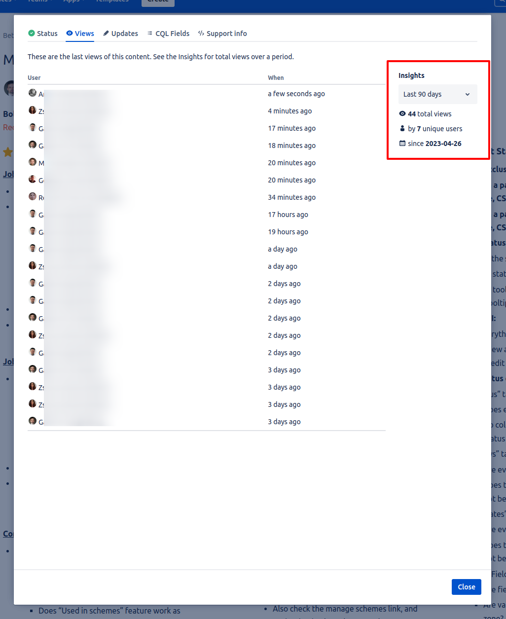 In the cloud version all view and update events are tracked and saved. You can get a sense of "how active is this page" with a single click:
